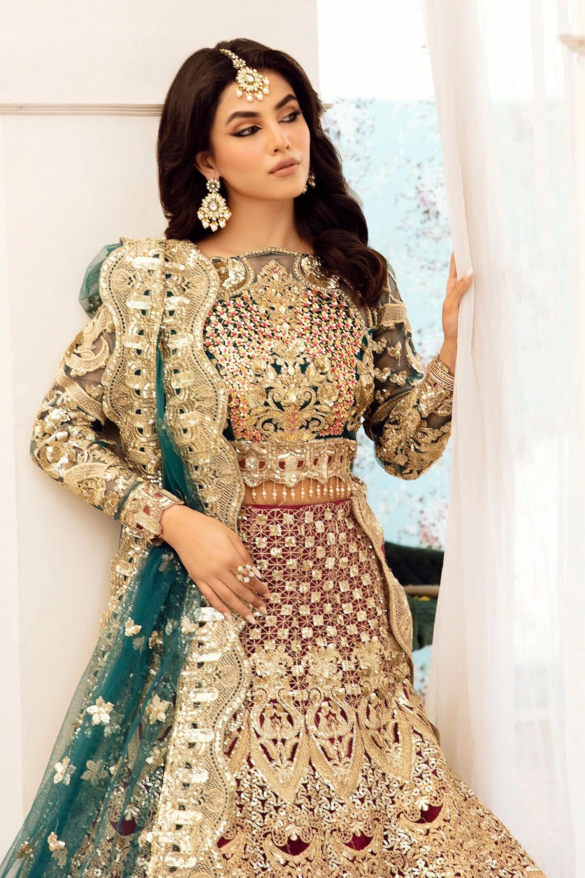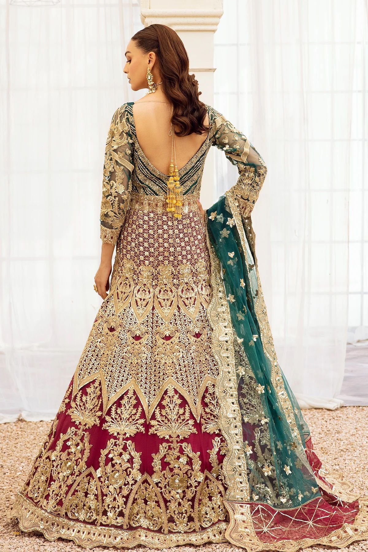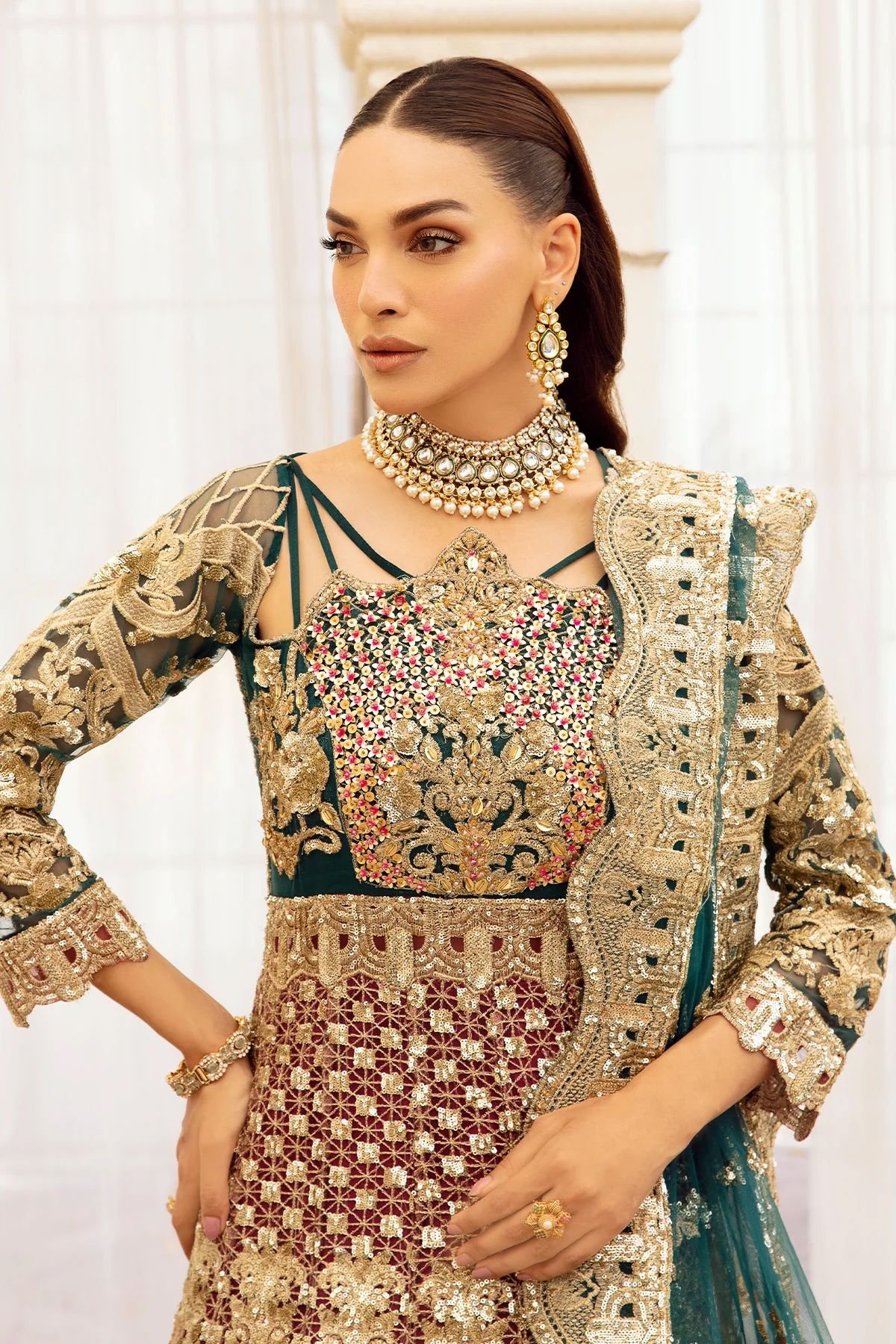 Embroidered net with handmade embellishments for front yoke.