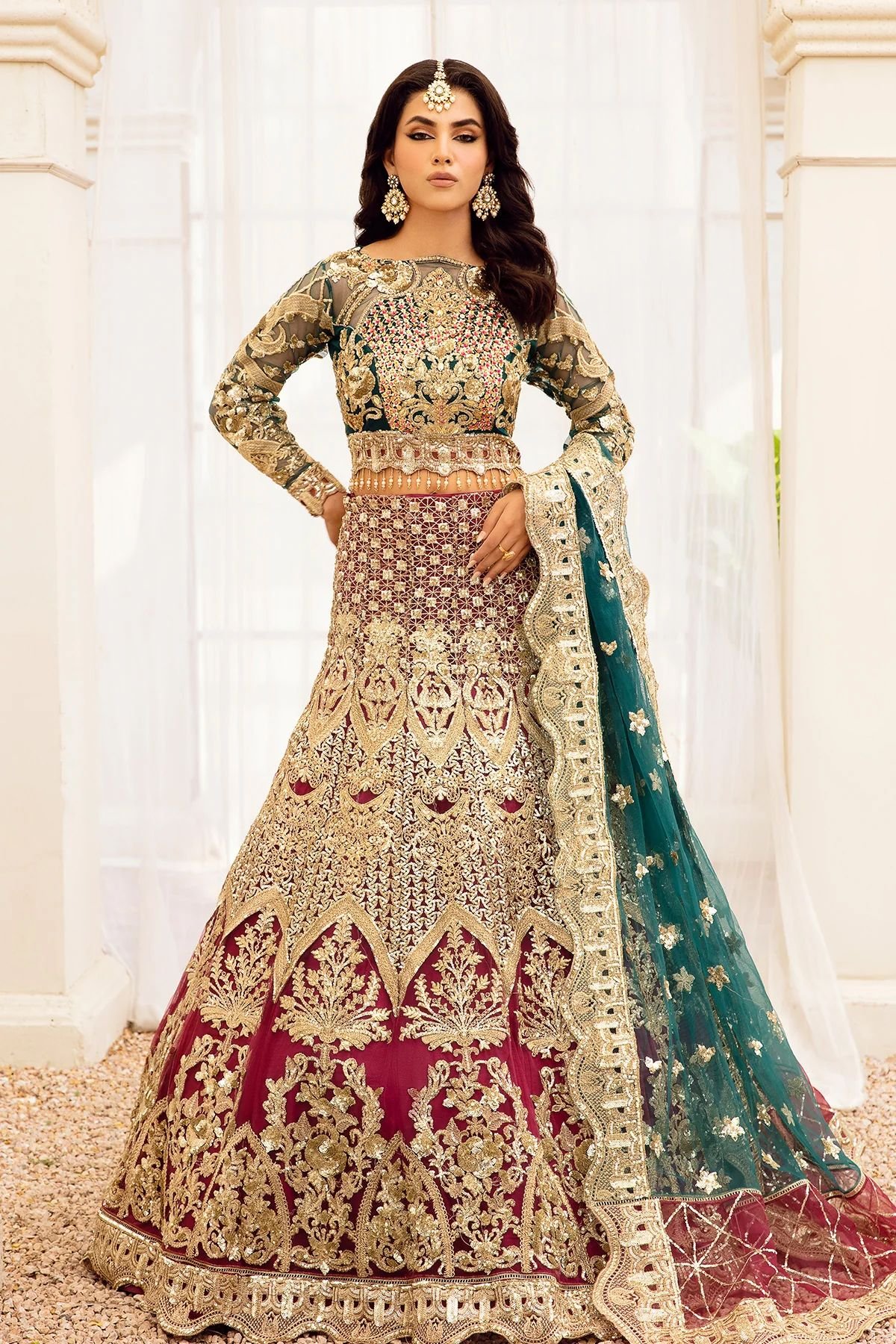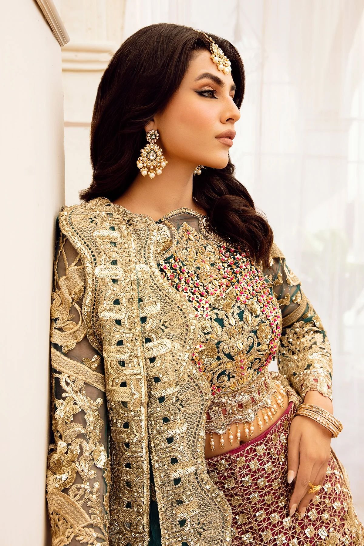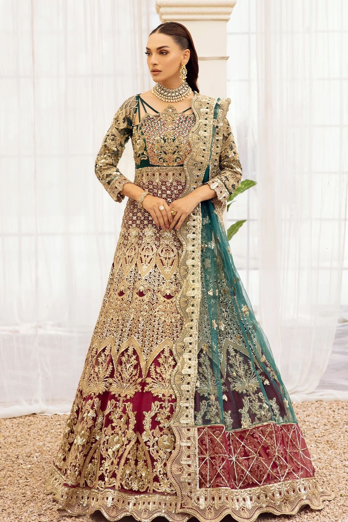 Embroidered net with handmade embellishments for front yoke.